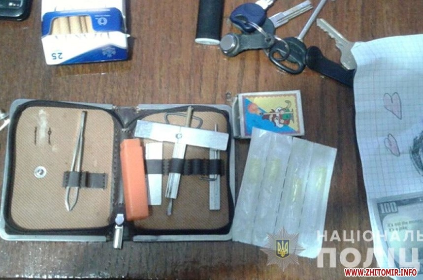 З цим їх і затримали оперативники кримінальної поліції ГУНП Житомирщини за кілька десятків метрів від під’їзду багатоповерхівки. Окрім того, при чоловіках виявлено специфічний набір інструментів, що використовується для відкриття або зламу замків.