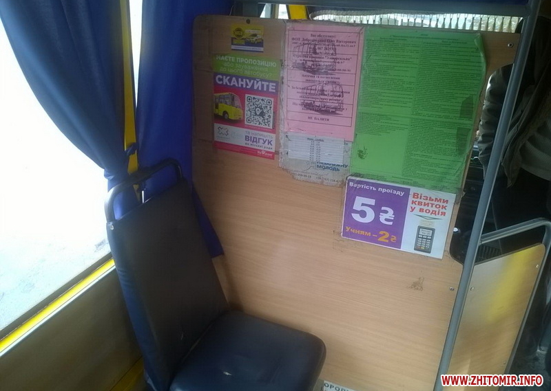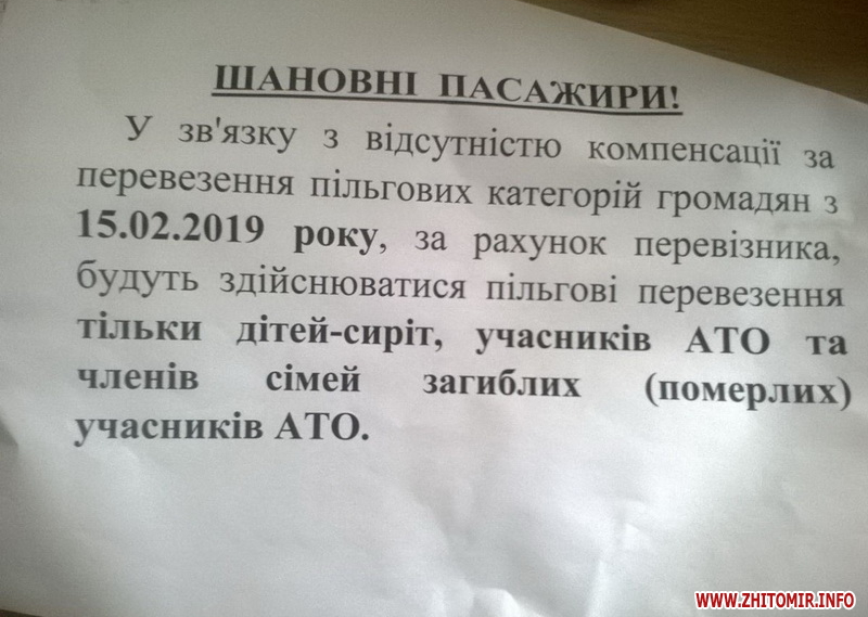 У житомирських маршрутних таксі під номером 23 зранку, 15 лютого, з’явилося оголошення про те, що пенсіонери та інваліди не мають права на пільговий проїзд.
