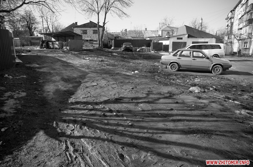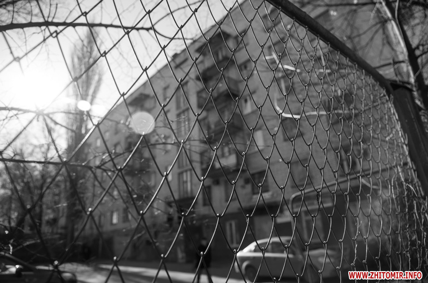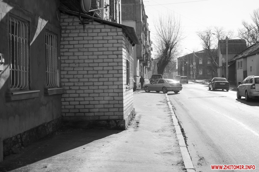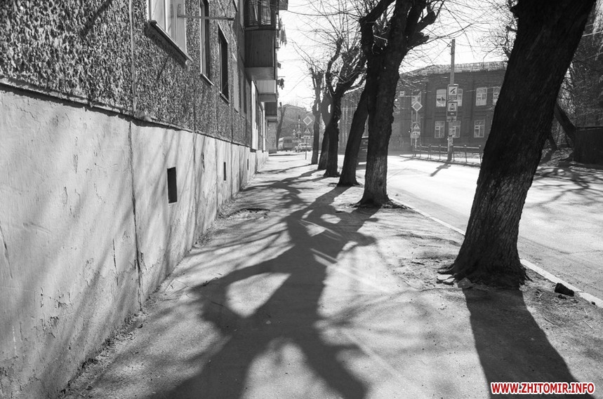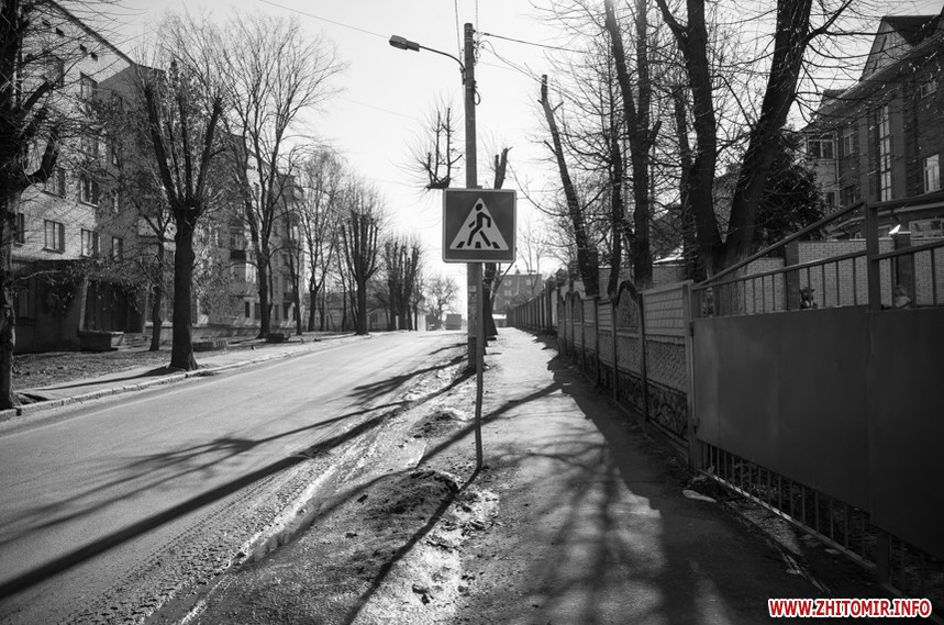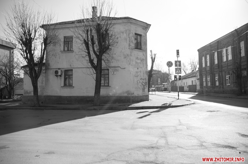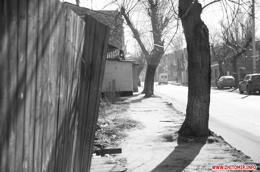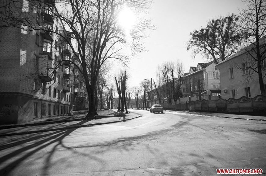 Це вулиці Старовільська, Ольжича, Володимирська (колишня Маяковського) в Житомирі, де старі будинки «освіжають» новою архітектурою. Похмуре місто, зігріте лютневим сонцем.