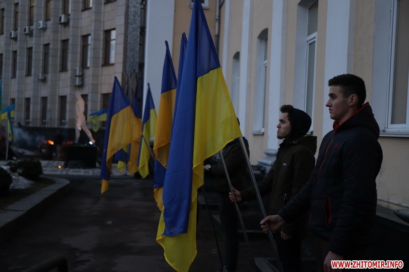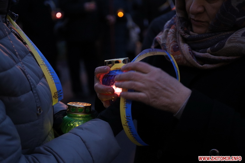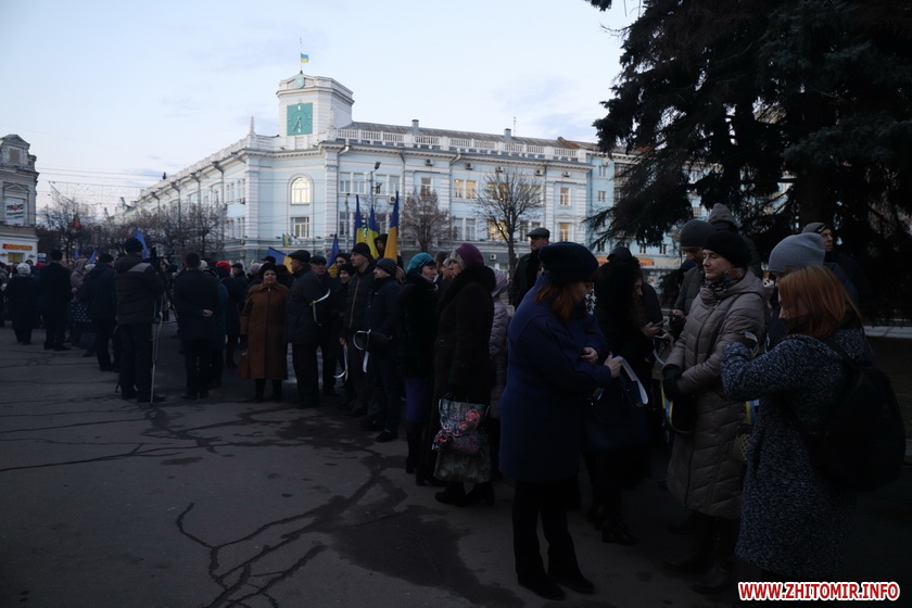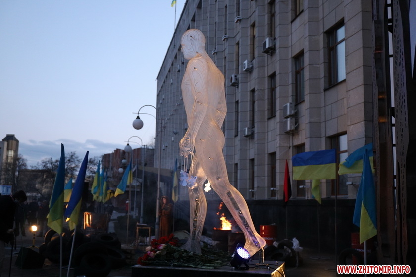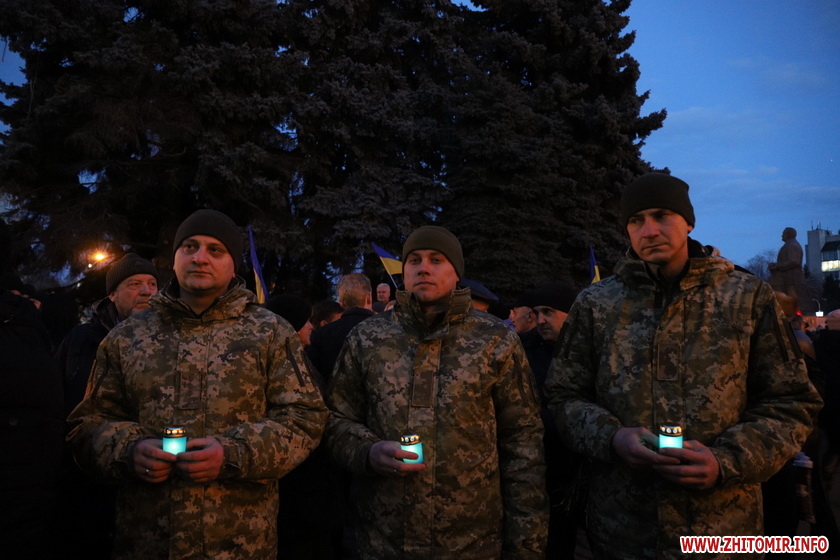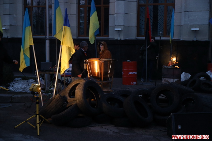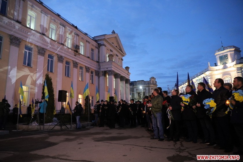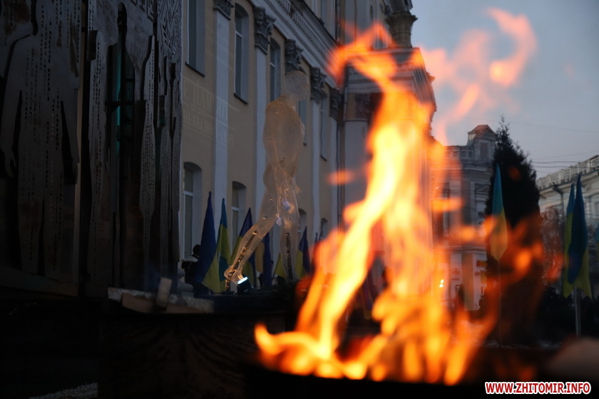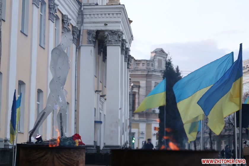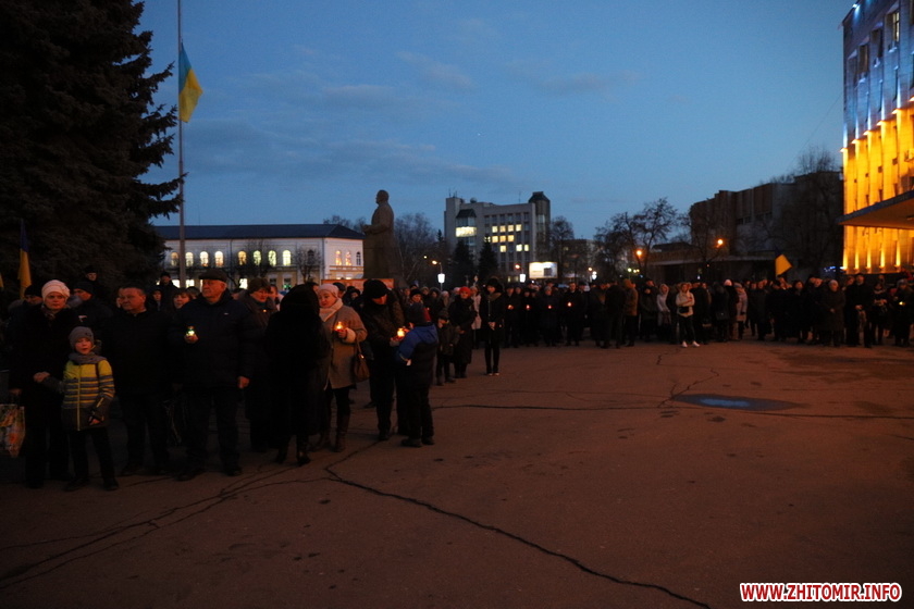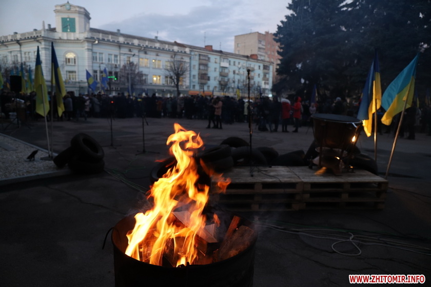 Надвечір 20 лютого на майдан Корольова у Житомирі привезли шини, дошки та запалили бочку – символічне нагадування про події 5-річної давнини. Близько 17.00 тут почали збиратися житомиряни, які прийшли згадати події Революції Гідності та пом’янути Героїв Небесної сотні.