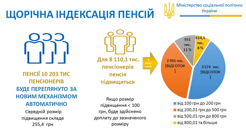 «На виконання закону про загальнообов’язкове пенсійне страхування, Урядом було визначено порядок і дату щорічної індексації, а саме з 1 березня 2019 року. Коефіцієнт збільшення показника середньої заробітної плати, доходу з якого було сплачено внески, становить 1,17. На 1 березня 2019 року пенсії будуть автоматично перераховані для 10 мільйонів 200 тисяч пенсіонерів, а середній розмір підвищення складе 255 грн. Це не означає, що усі отримають однаково 255 гривень, адже кошти розподіляються відповідно до формули. Реальне підвищення відбудеться для 8 мільйонів пенсіонерів, але підвищення не буде меншим за 100 гривень», - сказав Андрій Рева.