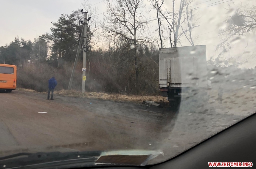 Вранці 5 березня на бердичівській трасі, неподалік повороту до смт Гуйва Житомирського району, сталася дорожньо-транспортна пригода за участю приміського автобуса № 115 «Житомир – Озерне» та вантажівки.