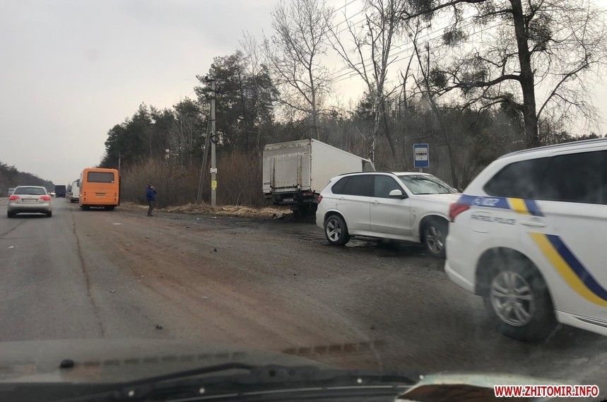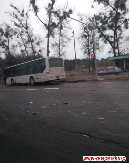 «5 березня, о 7.31 год., на 7 км автодороги Житомир – Могилів-Подільський сталася дорожньо-транспортна пригода. Водій, 1959 року народження, керуючи автомобілем Mercedes, не дотримався безпечної дистанції та здійснив зіткнення з рейсовим автобусом MAN № 115 «Житомир – Озерне», під керуванням водія, 1987 року народження. В наслідок ДТП транспортні засоби отримали механічні пошкодження. Двоє пасажирів автобуса MAN отримали тілесні ушкодження та були госпіталізовані до Житомирської центральної районної лікарні», – поінформувала прес-офіцер патрульної поліції Житомирської області Тетяна Носадчук.