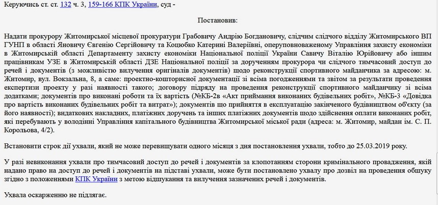 Богунський районний суд м.Житомира 25 лютого надав прокурору Житомирської місцевої прокуратури, слідчим слідчого відділу Житомирського відділу поліції ГУНП в області, оперуповноваженому Управління захисту економіки в Житомирській області Департаменту захисту економіки Національної поліції України тимчасовий доступ до речей і документів, які перебувають у володінні управління капітального будівництва Житомирської міської ради.