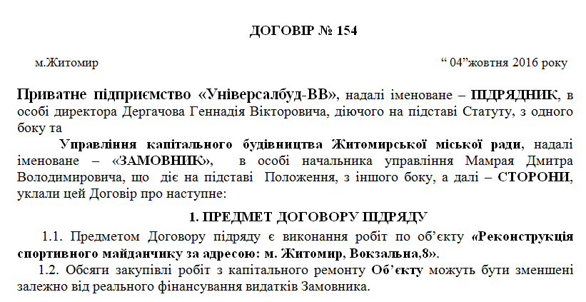 Договір на реконструкцію спортмайданчика на Вокзальній загальною вартістю 1 млн 410 тис. 181,20 грн 4 жовтня 2016 року з житомирським приватним підприємством «Універсалбуд-ВВ» підписав начальник УКБ Дмитро Мамрай, який з 8 вересня 2016 року був призначений на посаду начальника управління капітального будівництва і 30 грудня цього ж року звільнений за угодою сторін.