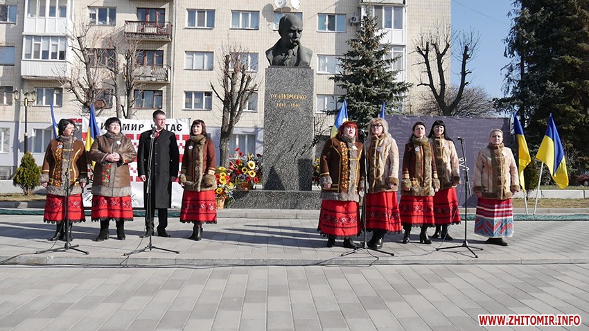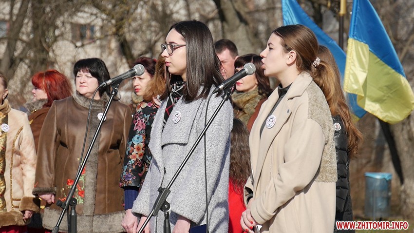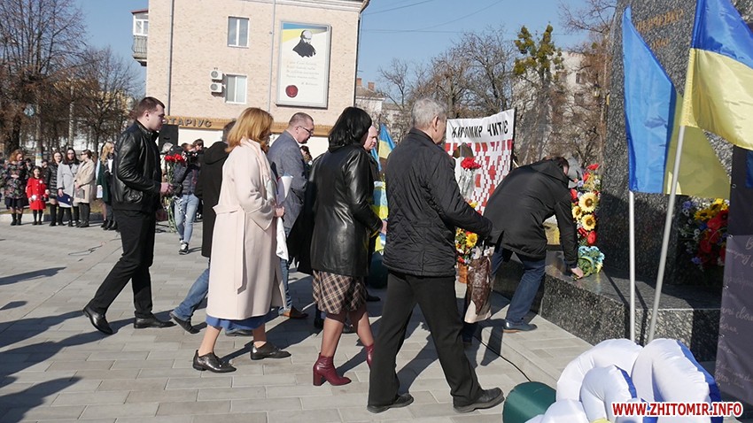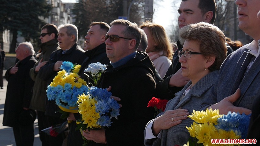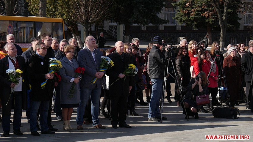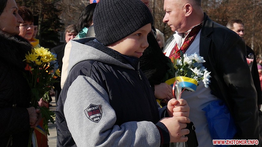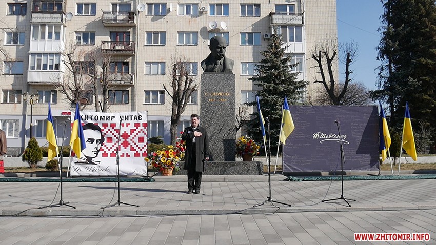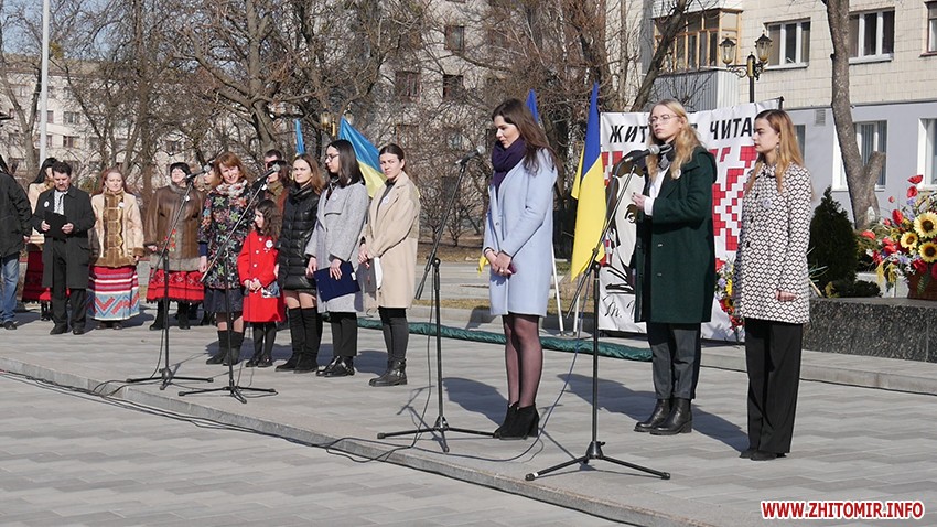 Біля пам’ятника Тарасу Шевченку в Житомирі 9 березня зібралося кілька сотень містян, аби відзначити 205-ту річницю народження Кобзаря. Розпочалися урочистості традиційно зі спільного виконання Гімну. Опісля слово взяли творчі колективи, артисти яких не лише декламували вірші видатного поета, але й співали їх. А от студенти пішли іще далі – взялися читати твори Шевченка іноземними мовами: англійською, німецькою та французькою.