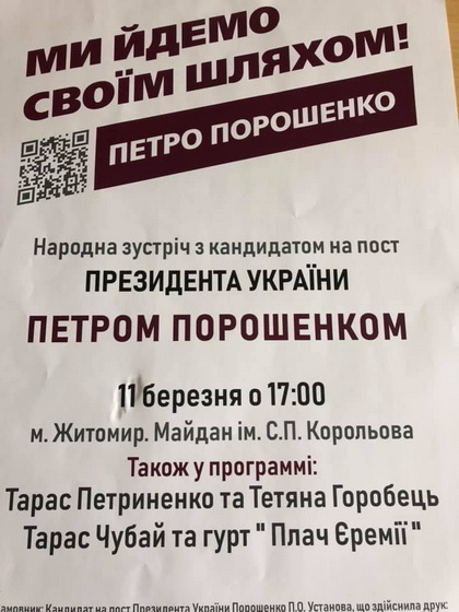 «11 березня о 17 год. в місті Житомирі на майдані С. Корольова відбудеться зустріч з Президентом України Петром Порошенком. Запрошуємо всіх бажаючих взяти участь у заході», – йдеться в анонсі.