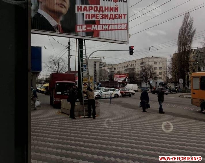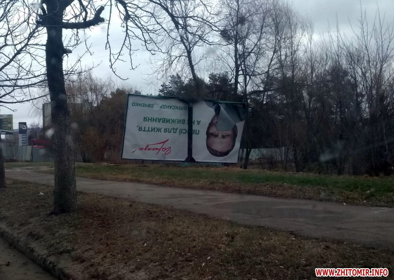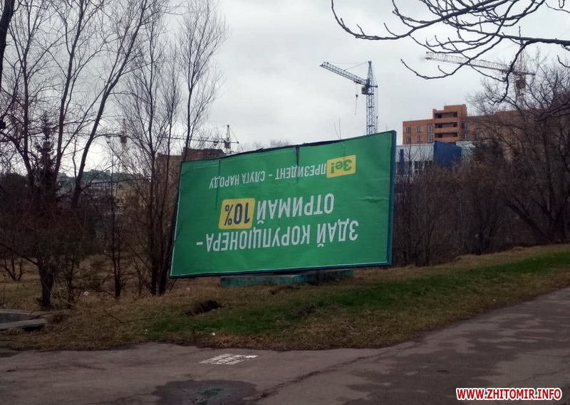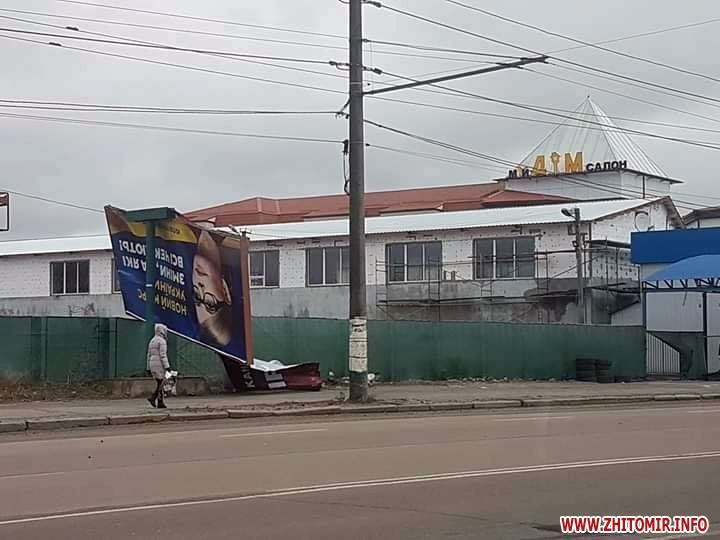 Читачі Житомир.info повідомляють про два зламані білборди з рекламою кандидатів у президенти біля Центру зайнятості на Корбутівці, та про «двоповерхову» рекламну конструкцію на ринку «Хмільники» на Богунії, яку розхитує вітер, і тому її підперли вантажівкою.