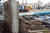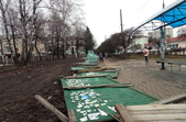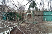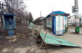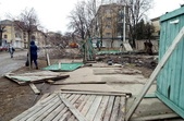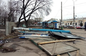 Зокрема, у сквері на перехресті Лятошинського-Небесної сотні рекламну конструкцію «вивернуло» з бетонною підніжкою, а дерев’яний паркан лежить на тротуарі.