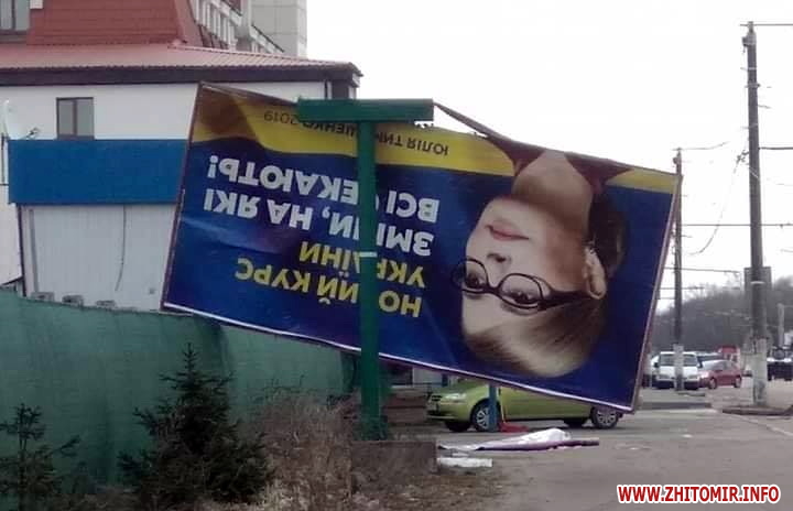 О 14 годині у фейсбук-групі Нефайний Житомир з'явилося фото пошкодженого вітром білборду біля магазину плитки "Мій дім" на проспекті Незалежності: вітер зламав навпіл рекламну конструкцію із зображенням кандидатки у президенти Юлії Тимошенко (фото нижче).