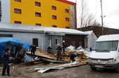 «11 березня о 12:04 до служби порятунку «101» надійшло повідомлення про те, що у м. Коростишів через сильні пориви вітру з технічного приміщення будівлі магазину «Фуршет» зірвало покрівлю – металевий лист розміром 11х14 метрів, який впав на двох жінок. Внаслідок негоди на місці події загинула мати та важко травмована її донька 1995 р. н. Рятувальники провели роботи по діставанню з-під уламків покрівлі обох жінок. Наразі постраждала донька у важкому стані знаходиться у реанімаційному відділенні міської лікарні. Бійці ДСНС проводять роботи щодо укріплення покрівлі. До ліквідації наслідків події в Коростишеві залучено 1 одиницю пожежно-рятувальної техніки та 8 чоловік особового складу», - повідомили рятувальники.