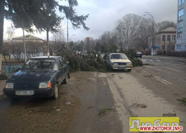 Поламано дві ялинки біля міськради, поблизу готелю «Дружба», ще одна впала поблизу меморіалу «Слава героям». Дерево впало на один з дитсадків. Похилився знак поблизу залізничного переїзду. При вході до Північного ринку в районі м’ясокомбінату вітер зніс торгові прилавки. На їдальні Бердичівського коледжу промисловості, економіки та права знесло дах. Звалене дерево на певний час перекрило одну смугу траси Бердичів-Житомир (джерело – Бердичів.BIZ):