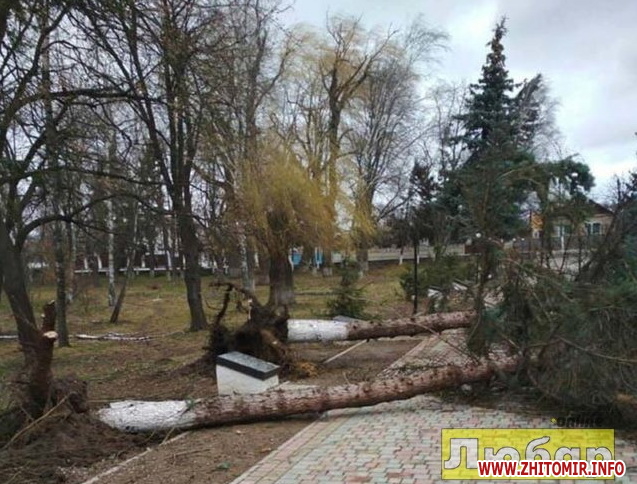 Біля гімназії поламав дві ялини, вони впали на дорогу і обірвали дроти. Повикорчовувало дерева у парку Слави. Зриває рекламні банери, перевертає холодильники біля магазинів, дахи будинків та паркани (сайт Любар онлайн).