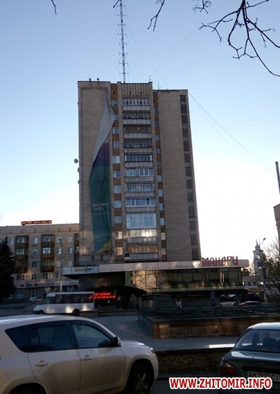 Нагадаємо, новий банер на 12-поверхівці з’явився в грудні 2015 року без дозволу міської влади. На засіданні виконавчого комітету Житомирської міської ради 21 лютого 2018 року директор КП «Інспекція благоустрою м. Житомира» Юрій Юзвинський розповідав, що рішення про демонтаж рекламної конструкції на будинку №1 по вул.Перемоги приймалося ще в січні 2016 року, але об’єкт не вдалося демонтувати з технічних причин – не змогли домовитися з верхолазами.