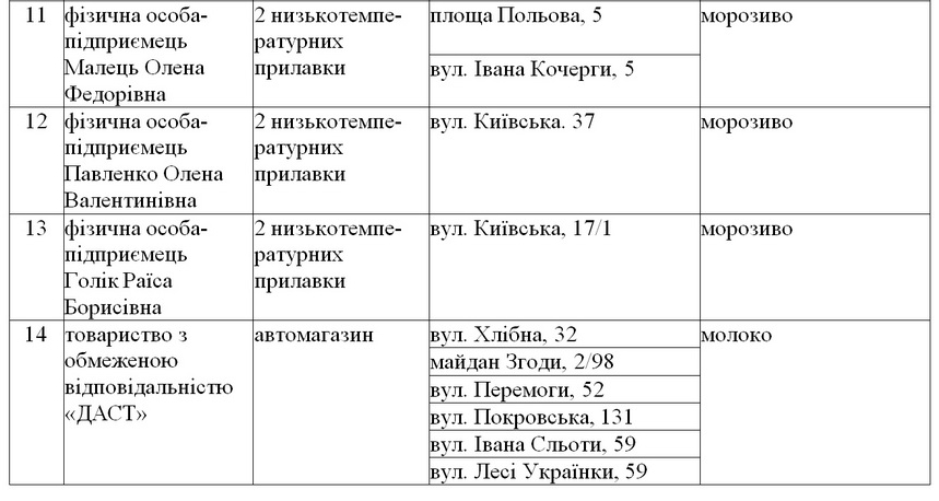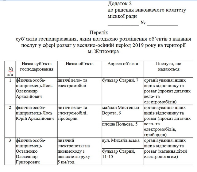 У додатку 1 – перелік 14 суб’єктів господарювання, яким збираються погодити розміщення об’єктів сезонної торгівлі. 12 ФОПів та одне ТОВ збираються торгувати традиційною літньою продукцією: квасом, безалкогольними напоями, морозивом та кукурудзою у стакані. А ось житомирське ТОВ «ДАСТ» збирається за п’ятьма адресами торгувати молоком з автомагазинів.