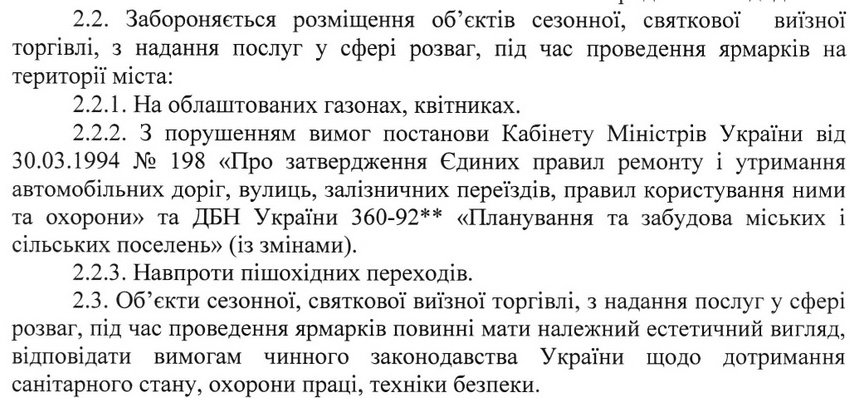 «Зобов’язати суб’єктів господарювання, вказаних в додатках 1, 2: здійснювати діяльність без права передачі в оренду; утримувати об’єкти сезонної торгівлі, з надання послуг у сфері розваг в належному технічному та естетичному вигляді; у разі пошкодження тротуарного покриття в процесі здійснення господарської діяльності у місячний термін відновити це тротуарне покриття за власний рахунок; у разі зміни містобудівної ситуації здійснити демонтаж об’єкта сезонної торгівлі упродовж трьох днів з моменту надходження відповідного повідомлення від департаменту економічного розвитку міської ради; під час організації культурно-масових заходів у місцях їх проведення зміщувати об’єкти сезонної торгівлі на відстань, визначену організатором вищезазначеного заходу; укласти договір на вивіз твердих побутових відходів на період здійснення господарської діяльності з відповідним підприємством – перевізником твердих побутових відходів за територіальним принципом», - йдеться у проекті рішення.