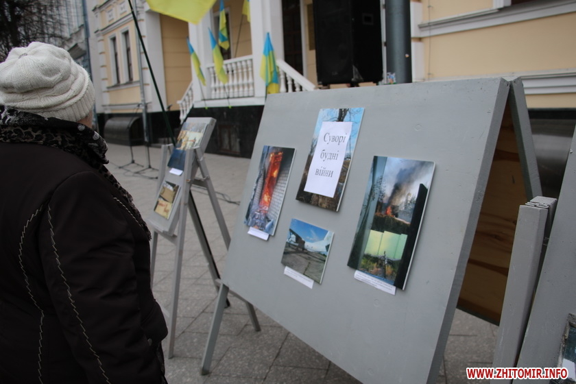 14 березня у День українського добровольця на пішохідній вулиці Михайлівській в Житомирі влаштували тематичну фотосушку та виставку фотографій «Суворі будні АТО».