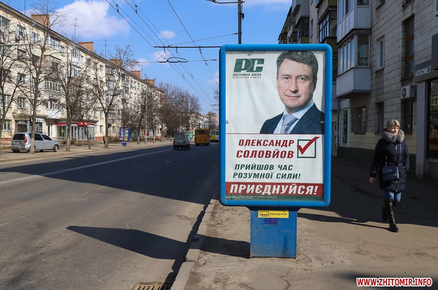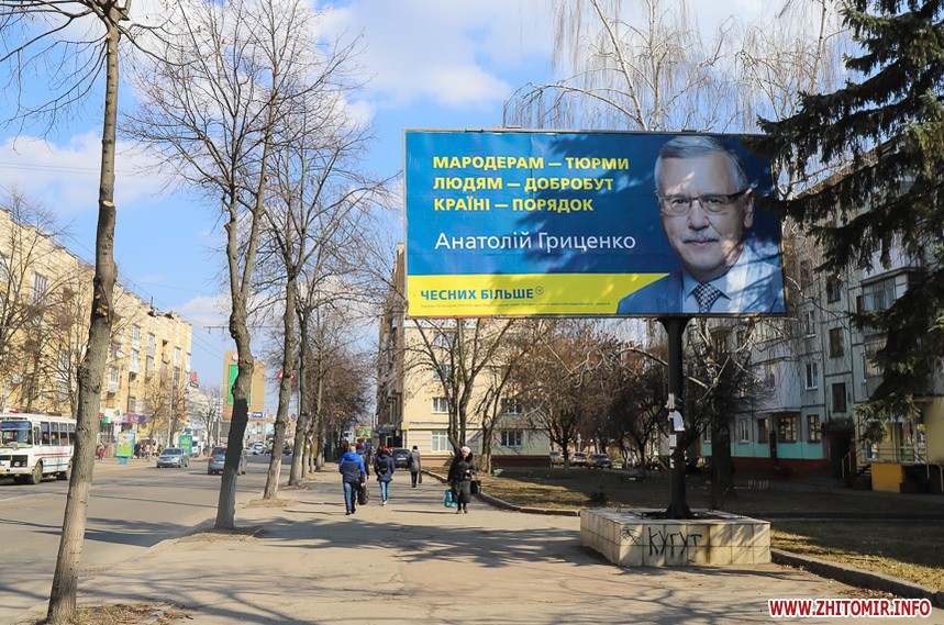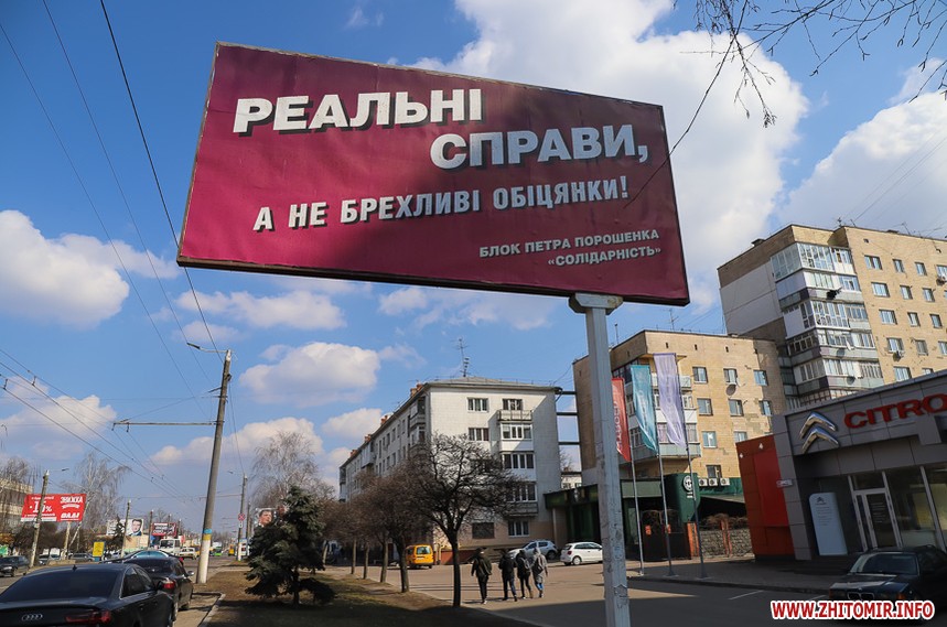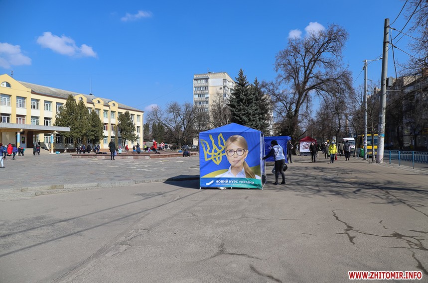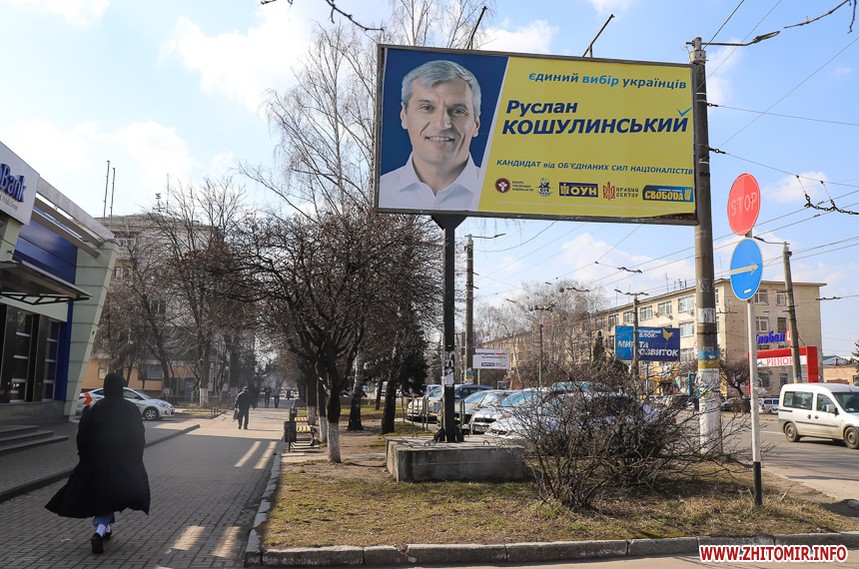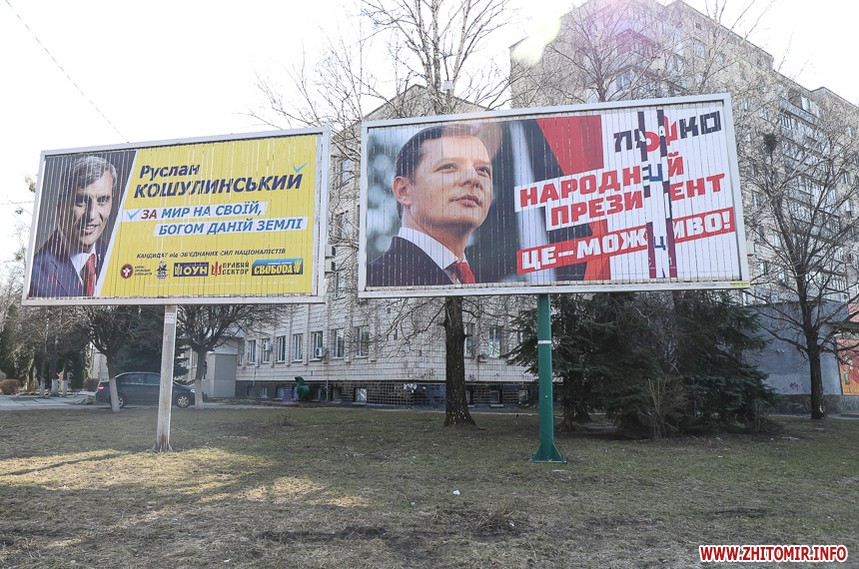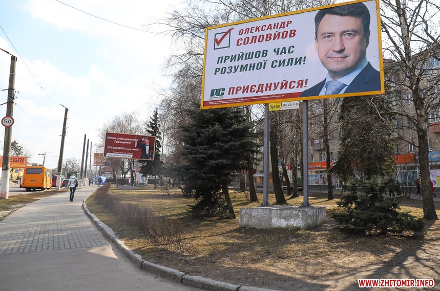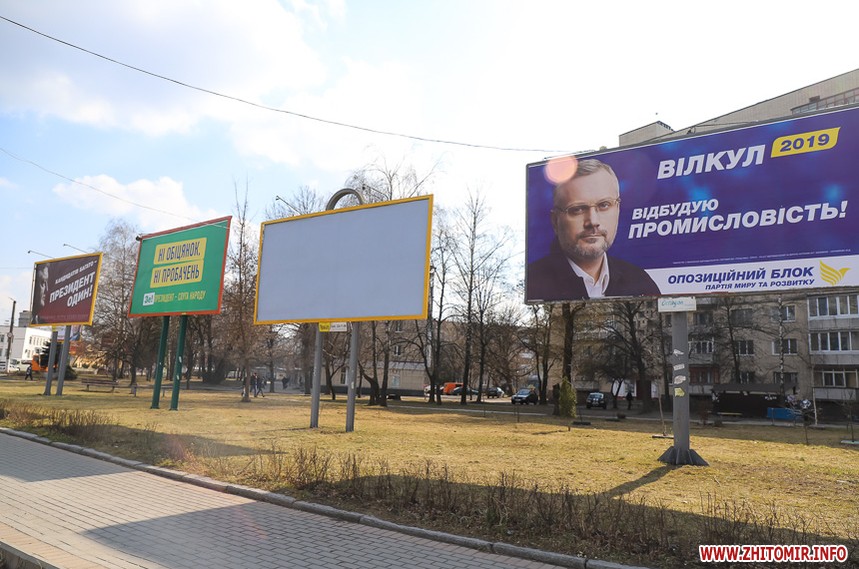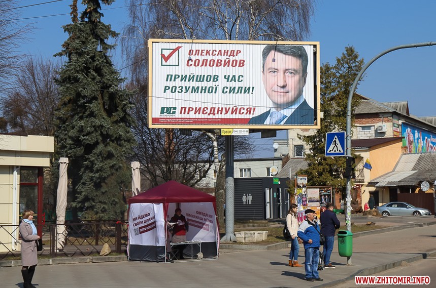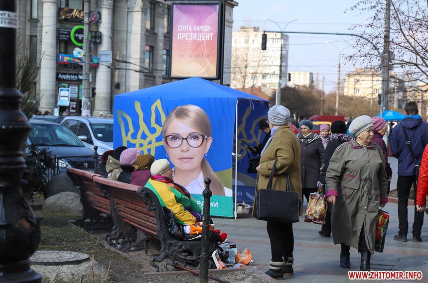 Станом на 15 березня, майже за два тижні до дня голосування, на вулицях Житомира розміщує агітацію менш ніж половина кандидатів у президенти, а роздачею друкованої продукції з агітаційних наметів взагалі займаються представники лише кількох претендентів, найактивніше – від діючого президента Петра Порошенка та лідера «Батьківщини» Юлії Тимошенко.