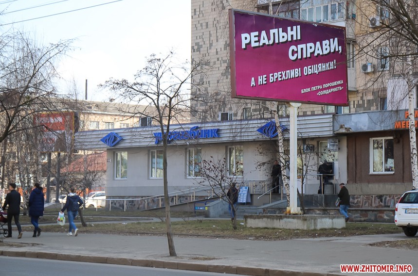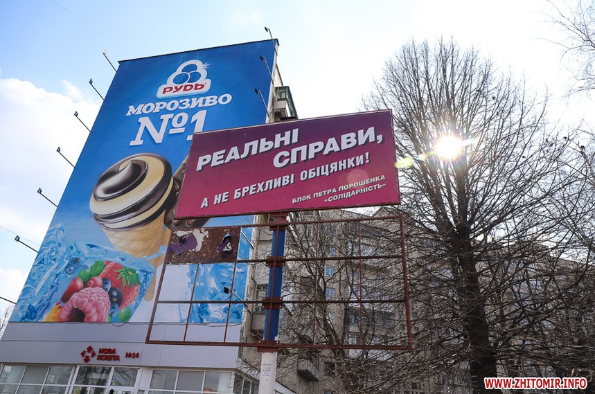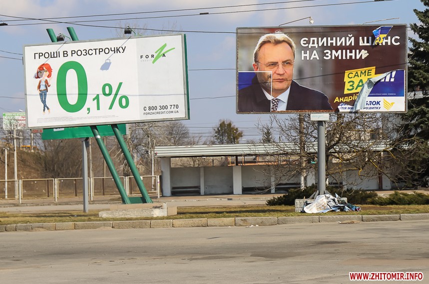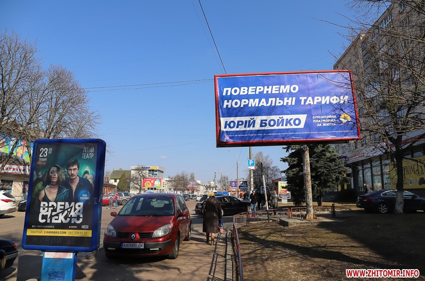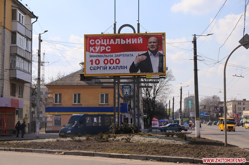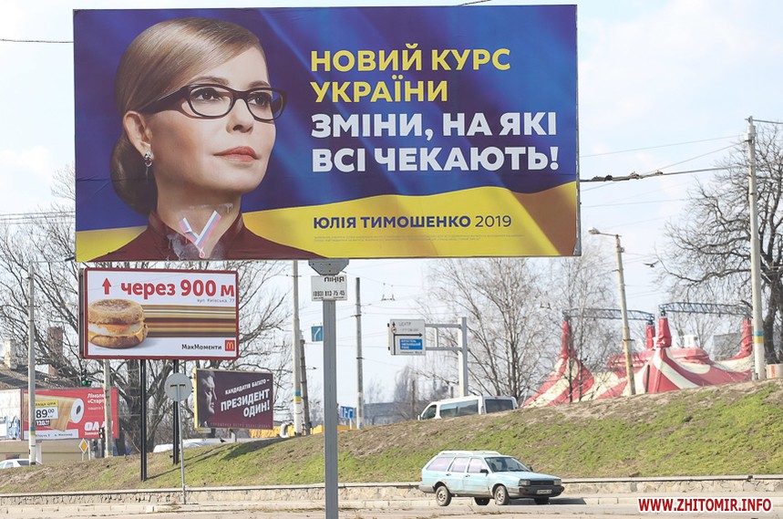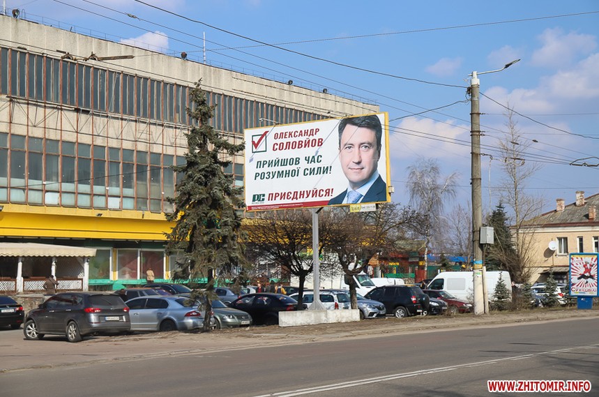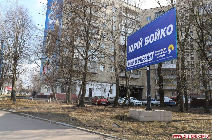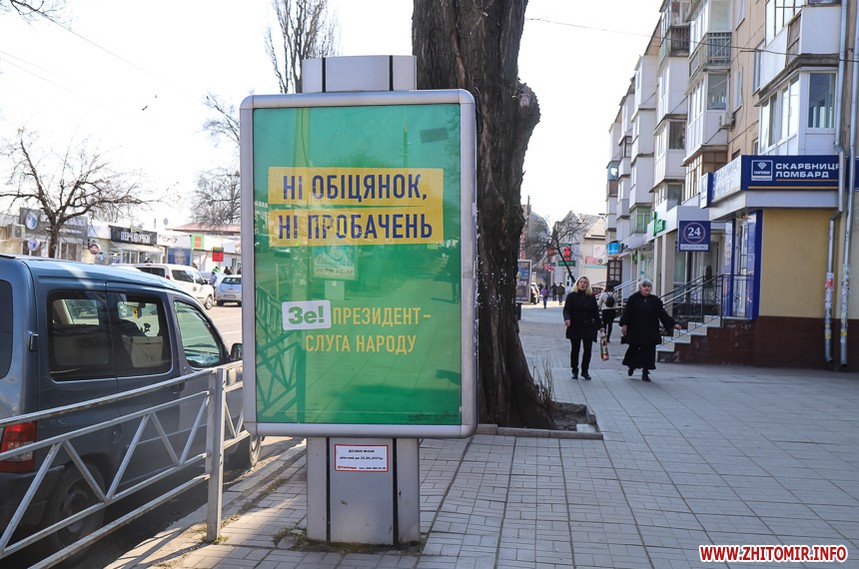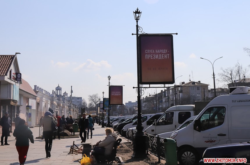 Станом на 15 березня, майже за два тижні до дня голосування, на вулицях Житомира розміщує агітацію менш ніж половина кандидатів у президенти, а роздачею друкованої продукції з агітаційних наметів взагалі займаються представники лише кількох претендентів, найактивніше – від діючого президента Петра Порошенка та лідера «Батьківщини» Юлії Тимошенко.
