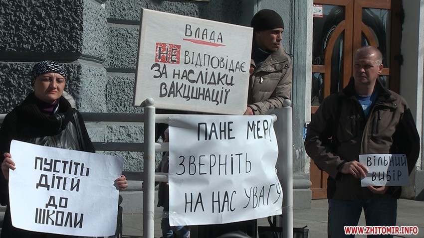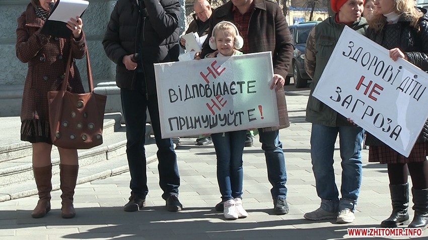 18 березня під стінами Житомирської міської ради втретє пройшла акція «Дітям - вільний доступ до освіти». Близько півсотні батьків вкотре вимагали скасувати рішення про заборону відвідування шкіл та дитячих садочків дітям без профілактичних щеплень.