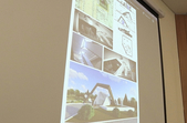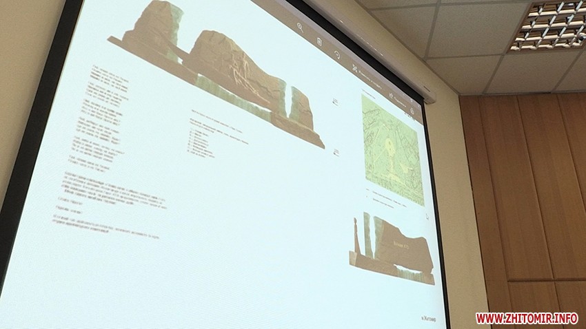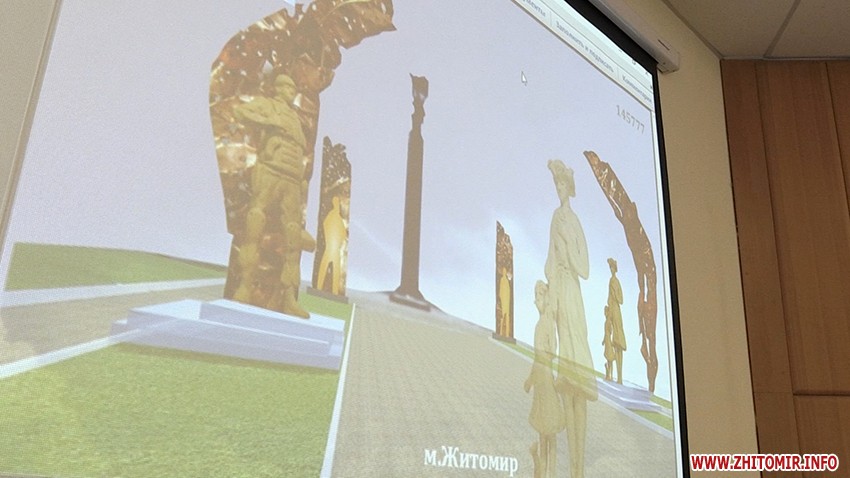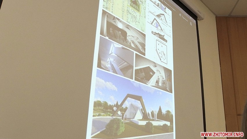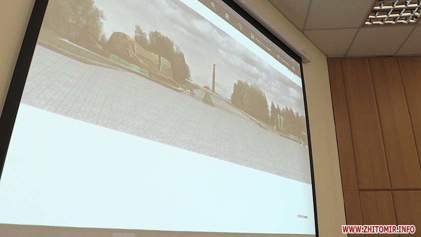 «Питання по затвердженню результатів конкурсу, що відбувся на локації Корбутівка, біля Меморіалу Слави. У минулому році ми оголосили конкурс, за побажаннями родин та представників громадських об’єднань ми пішли назустріч і обрали цю локацію. Було подано біля 13 пропозицій, серед них було обрано три найбільш цікаві. Вони отримали, відповідно, перше. друге, третє місця. Третє місце - учасники зі східної України. Пропозиція може розвиватись як у підземний простір з влаштуванням музею, так і надземна частина. Друге місце - біля меморіалу Слави ліворуч та праворуч ось така композиція. Перше місце - пропонується використання місцевого каміння, брили в поєднанні зі склом і скульптурна композиція. Призовий фонд там 30 тис. грн, 20 тис. грн і 10 тис. грн, здається», - розповідає головний архітектор Житомира Юрій Безбородов.