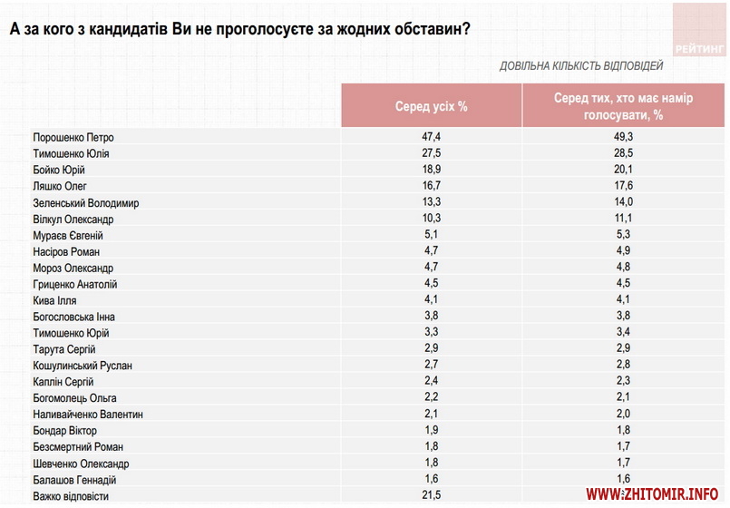 Антирейтинг кандидатів очолює П.Порошенко. Майже половина виборців не проголосували б за нього за жодних обставин. За Ю.Тимошенко не віддали б свої голоси близько 30%, за Ю.Бойка – 20%, О.Ляшка – 18%, В.Зеленського – 14%, О.Вілкула –11%.