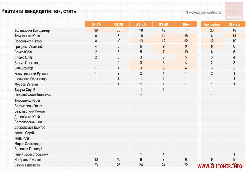 В.Зеленський має найміцніші електоральні позиції на Півдні та Сході,також у Центрі, на Заході, Півночі та у столиці. Ю.Тимошенко та П.Порошенко – у центрально-західних макрорегіонах. А.Гриценко – на Заході та Галичині, а Ю.Бойко та О.Вілкул. – на Півдні, Сході та Донбасі. О.Ляшко має відносно вищу підтримку у регіонах Заходу, Центру та Півночі. В.Зеленський є лідером симпатій серед молоді і людей середнього віку, Ю.Тимошенко – серед старших виборців. Якщо В.Зеленського, П.Порошенка та А.Гриценка відносно більше підтримують чоловіки, то Ю.Тимошенко – жінки.