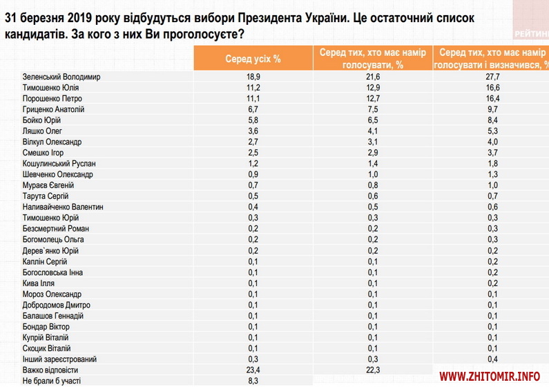 Результати спільного опитування КМІС, Центру Разумкова та Соціологічної групи Рейтинг. Вибірка: 15 000 респондентів в усіх областях України (без врахування населення АР Крим та окупованих територій Донецької та Луганської областей). Вибірка репрезентативна для населення України віком від 18 років за такими показниками як стать, вік, тип поселення та регіон проживання. Статистична похибка вибірки: не більше 0,8%. Терміни проведення: 5-14 березня 2019 року