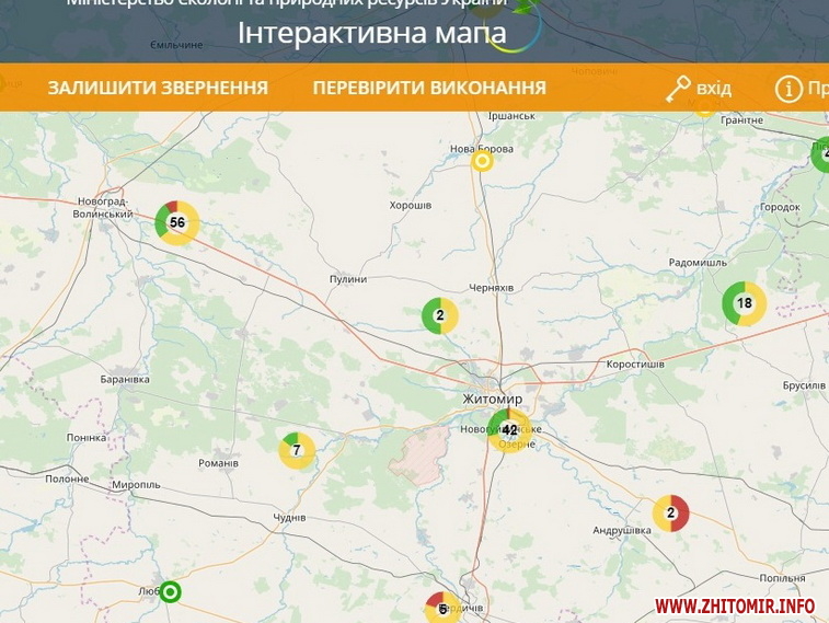 Згідно інтерактивної мапи, жителі Житомирської області фіксували стихійні сміттєзвалища у Житомирі та районі, Коростені, Малині, Олевську, Новограді-Волинському та районі, Романові та районі, Чуднові, Бердичеві, Андрушівці, Черняхові, Радомишлі та районі, в Брусилові, Народичах.