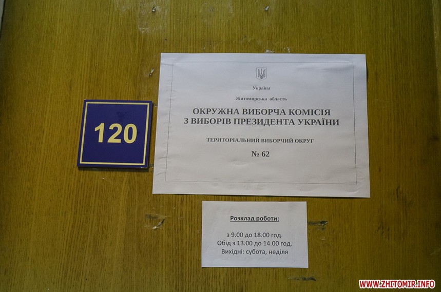 Окружна виборча комісія округу №62, до якого входить Корольовський район міста Житомира та частина Богунського району, знаходиться у приміщення міської ради. Саме туди 27 березня надійшло близько 169 тисяч бюлетенів для голосування у першому турі виборів президента України.