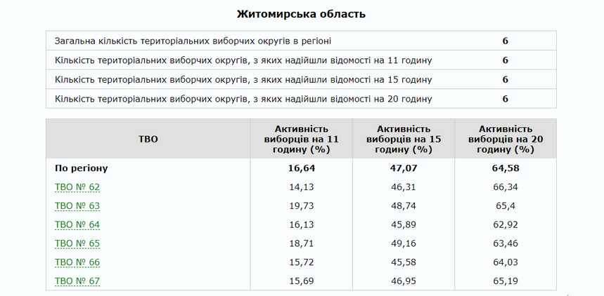 Тож, середня явка по Житомирській області, за даними ЦВК, склала 64,58%.