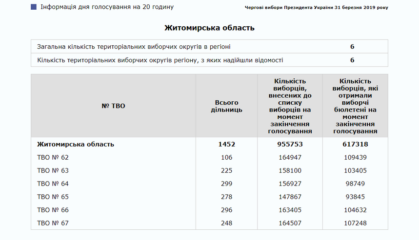 Нагадаємо, за даними Центральної виборчої комісії, 31 березня на території Житомирської області діє 1452 виборчі дільниці, в Житомирі – 106. Кількість виборців, внесених до списку на момент закінчення голосування: Житомир - 164947, область - 955857.