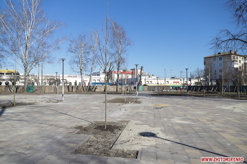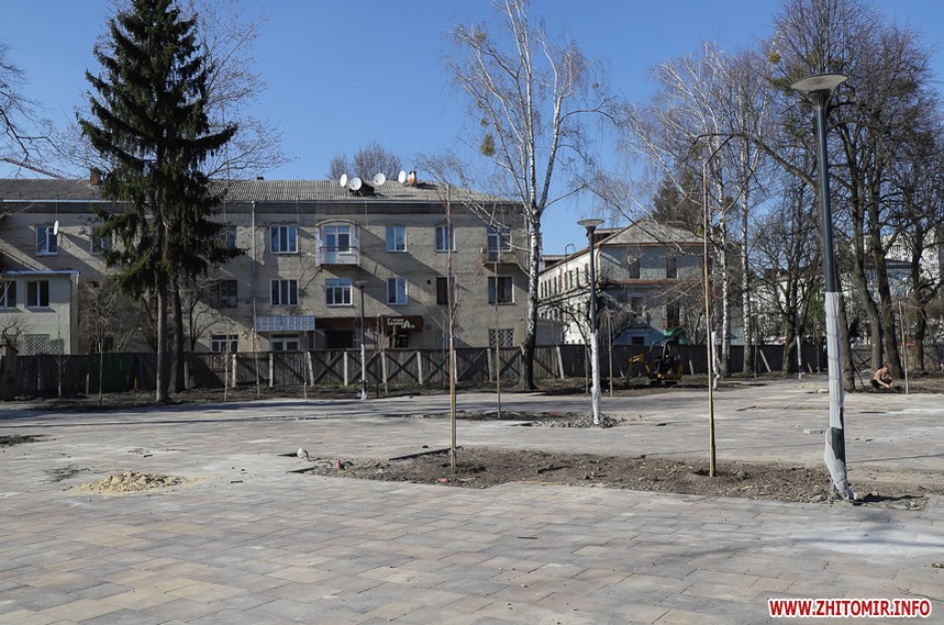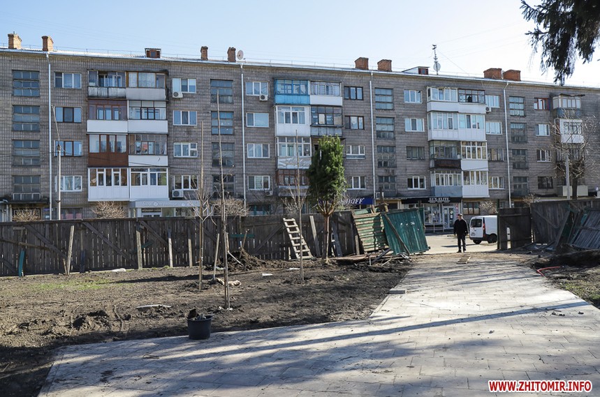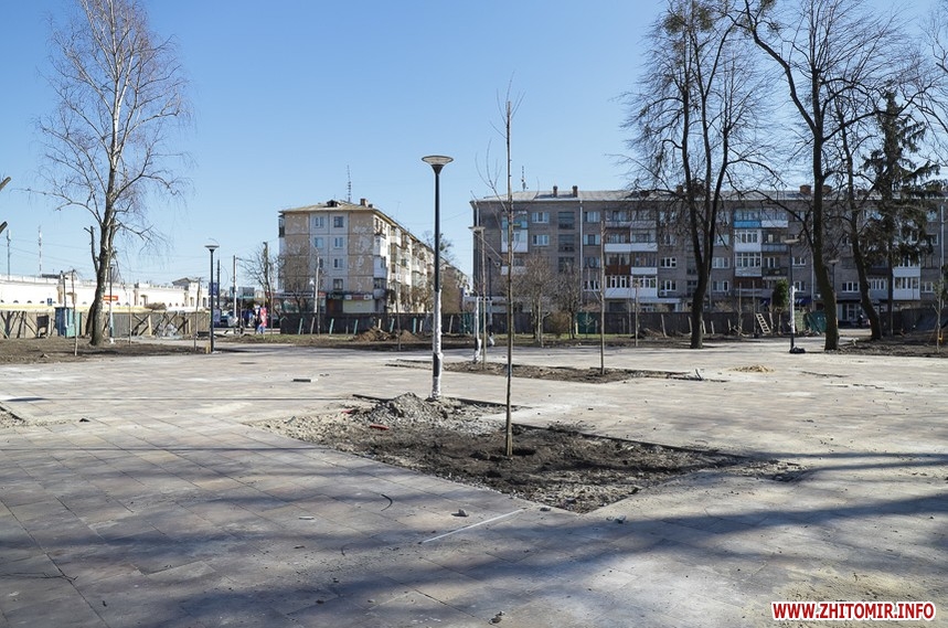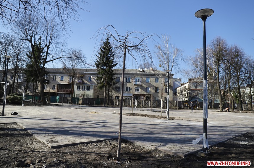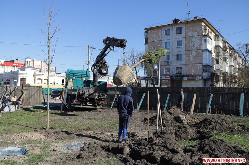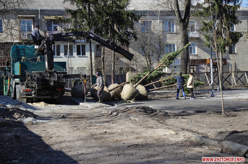 «У сквері, що на розі вулиць Лятошинського та Небесної сотні, асфальтове покриття замінено на тротуарну плитку, встановлено систему штучного автоматичного поливу та завершено роботи з освітлення. Розпочалися роботи з висадження зелених насаджень, які були завезені у місто 30 березня. Це - 8 кленів Фрімана, 7 червоних кленів, 5 кельрейтерія, 5 декоративних яблунь, 13 горобин, 13 кущів бузку, 6 сакур, 9 магнолій трьох сортів, 12 едонських вишень, десяток дрібнопильчатих вишень і 3 черемхи, які планують висадити протягом тижня.8 європейських сосон, кущові культури - гортензію, дерен, ялівець, які вже теж доставлено у Житомир, будуть висаджені згодом», - сказав Олександр Волокіта.