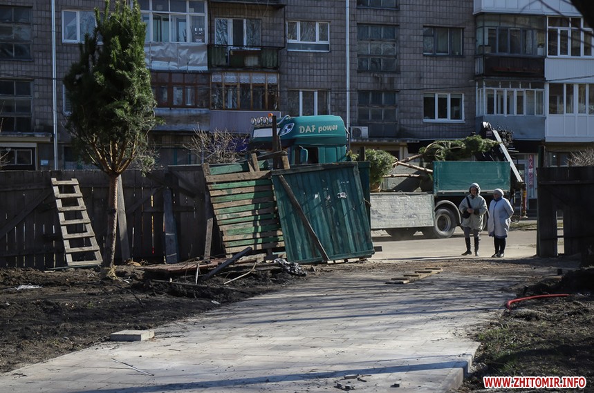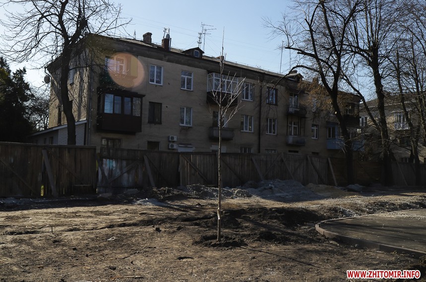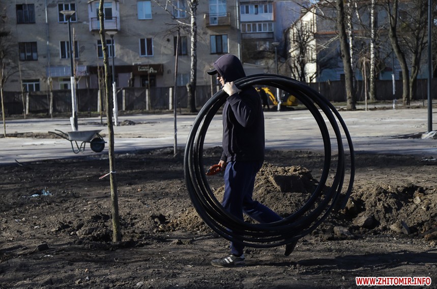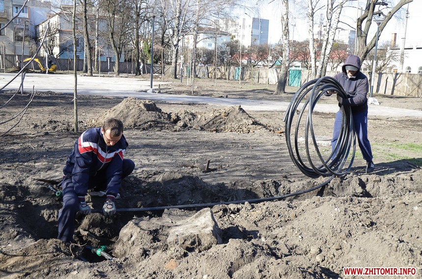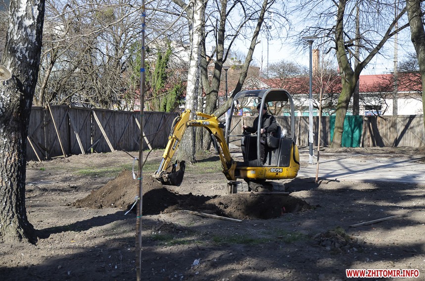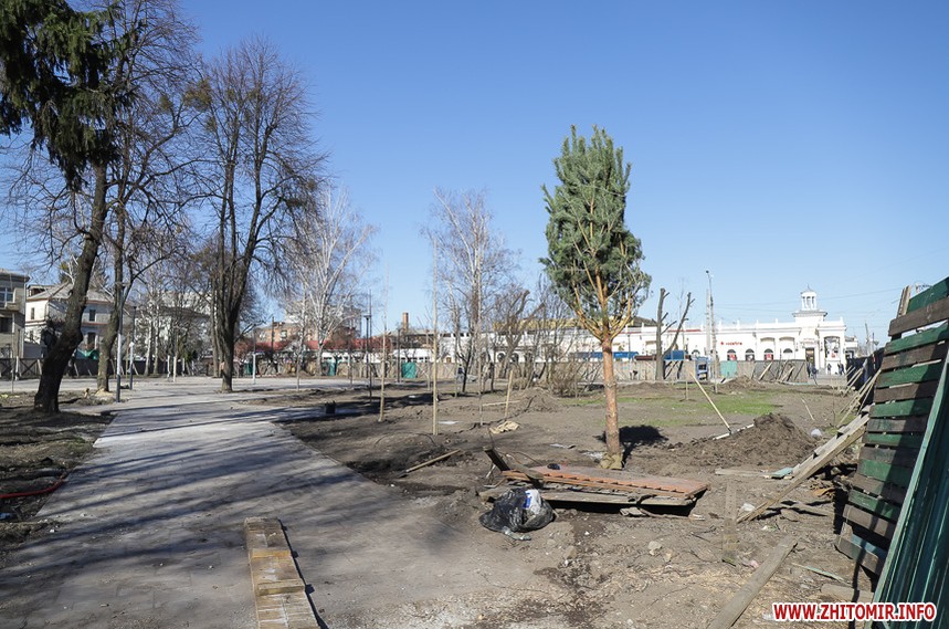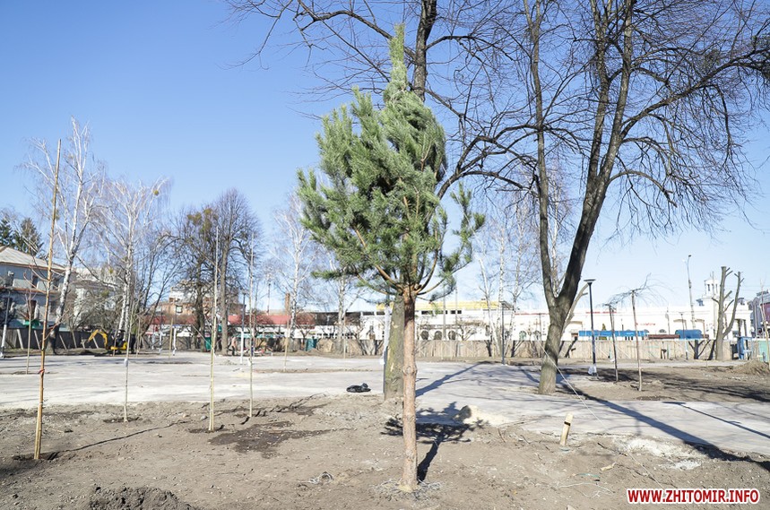 «У сквері, що на розі вулиць Лятошинського та Небесної сотні, асфальтове покриття замінено на тротуарну плитку, встановлено систему штучного автоматичного поливу та завершено роботи з освітлення. Розпочалися роботи з висадження зелених насаджень, які були завезені у місто 30 березня. Це - 8 кленів Фрімана, 7 червоних кленів, 5 кельрейтерія, 5 декоративних яблунь, 13 горобин, 13 кущів бузку, 6 сакур, 9 магнолій трьох сортів, 12 едонських вишень, десяток дрібнопильчатих вишень і 3 черемхи, які планують висадити протягом тижня.8 європейських сосон, кущові культури - гортензію, дерен, ялівець, які вже теж доставлено у Житомир, будуть висаджені згодом», - сказав Олександр Волокіта.