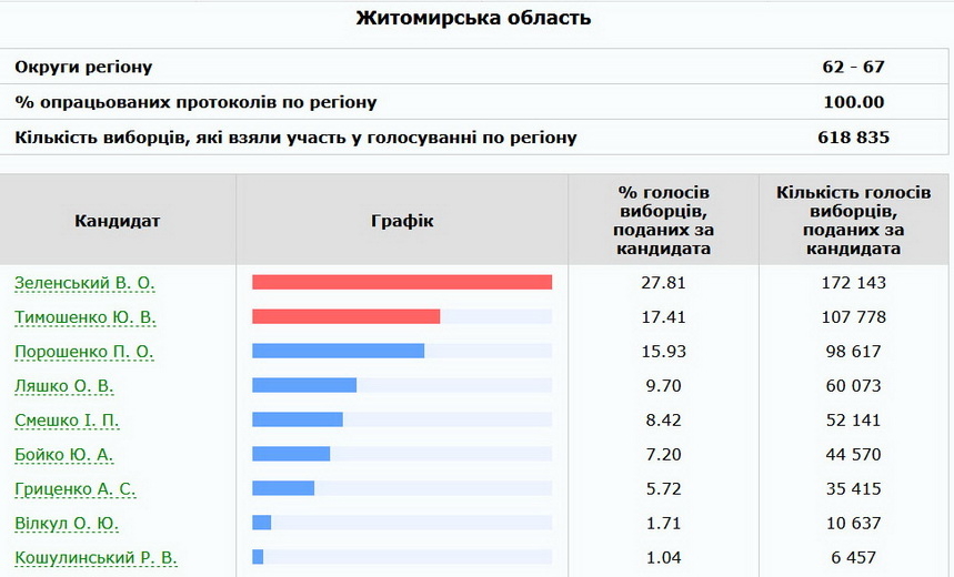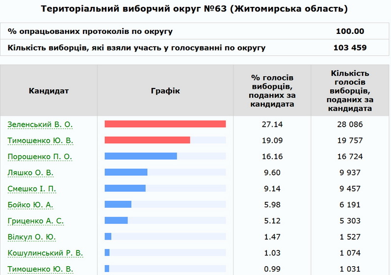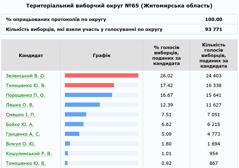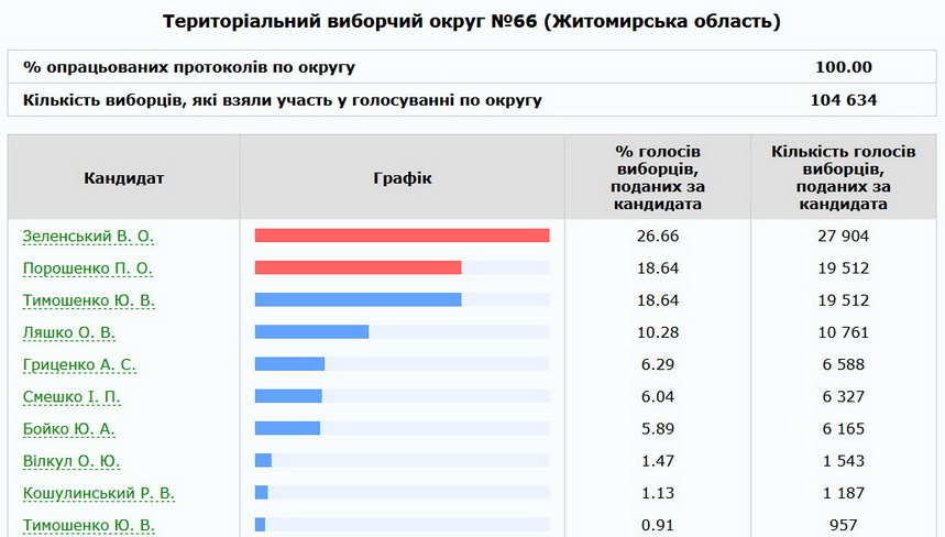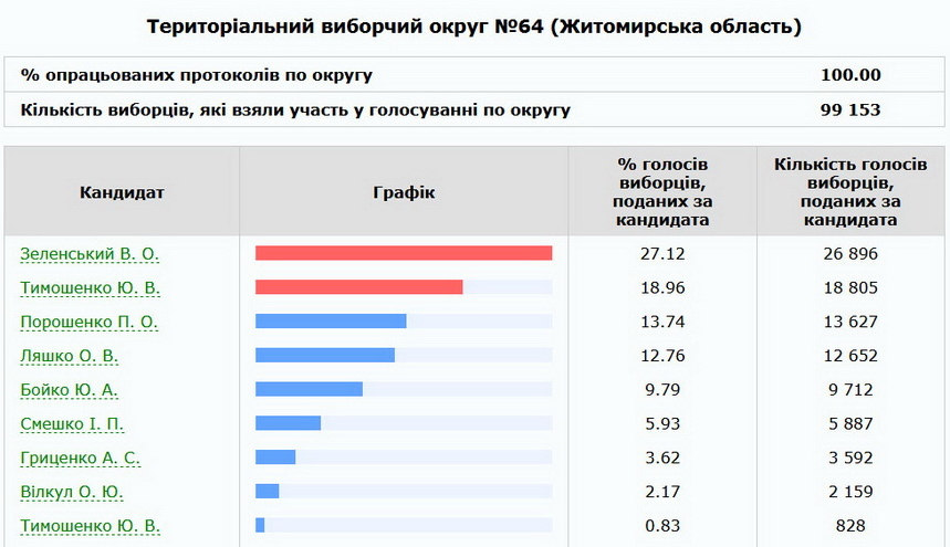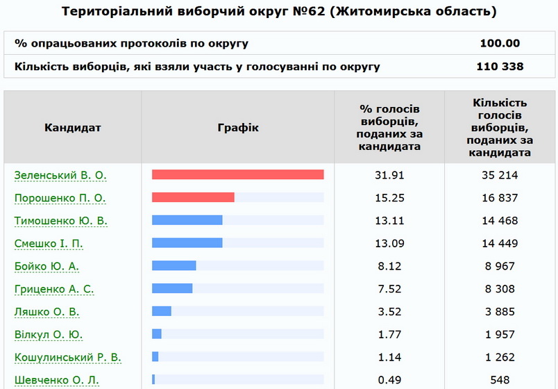 По округу №62 (Житомир) перша п’ятірка за результатами голосування виглядає так: Зеленський, Порошенко, Тимошенко, Смешко, Бойко.