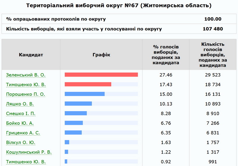 По округу №67 (центр – Чуднів): Зеленський, Тимошенко, Порошенко, Ляшко, Смешко.