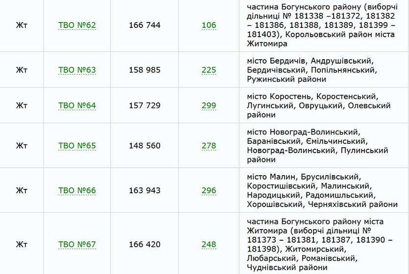 Нагадаємо, в окрузі №62 орієнтовна кількість виборців була 166 744, а на момент початку голосування за даними сайту ЦВК вже становила 164 082, різниця – 2662 виборцв. Дані про кількість виборців й в інших п’яти округах Житомирської області різняться від тих, що ЦВК вказувало до дня голосування. Нижче – скріншоти з сайту Центральної виборчої комісії: орієнтовна кількість виборців у ТВО та їхня кількість у списках на момент початку голосування 31 березня 2019 року.