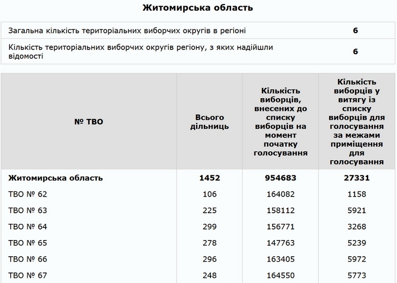 Станом на 20:10 год. 2 квітня Центральна виборча комісія отримала 100% протоколів з шести територіальних виборчих округів Житомирської області.