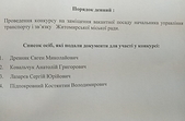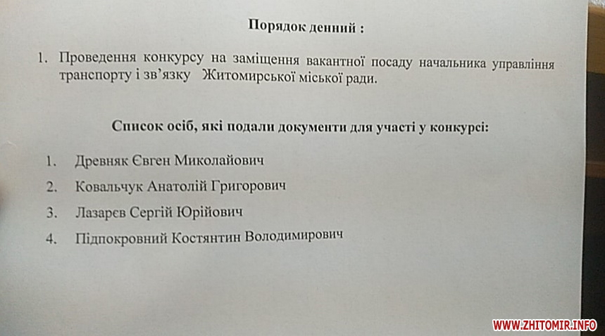 Серед чотирьох кандидатів є колишній працівник КП «Житомирське трамвайно-тролейбусне управління» Сергій Лазарєв, колишній керівник КП «Тролейбусне управління» Білоцерківської міської ради Костянтин Підпокровний, який до серпня 2013 року працював начальником управління транспорту і зв’язку Житомирської міської ради. Ще один претендент – Євген Древняк, який у 2018 році працював на підприємстві «Кромберг енд Шуберт» та в правлінні дорожнього будівництва та інфраструктури Житомирської обласної державної адміністрації. Четвертий претендент на посаду начальника управління – Анатолій Ковальчук, який минулого року отримував дохід від підприємницької діяльності та зарплату за основним місцем роботи в ДП «Житомирський ремонтний завод радіотехнічного обладнання "Промінь"» й виплати від Міністерства оборони України: одноразову грошову допомогу за вислугу років та при отриманні інвалідності 2 групи.
