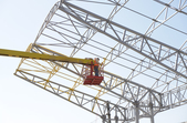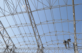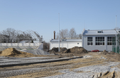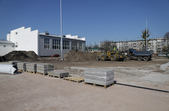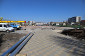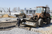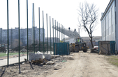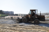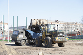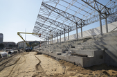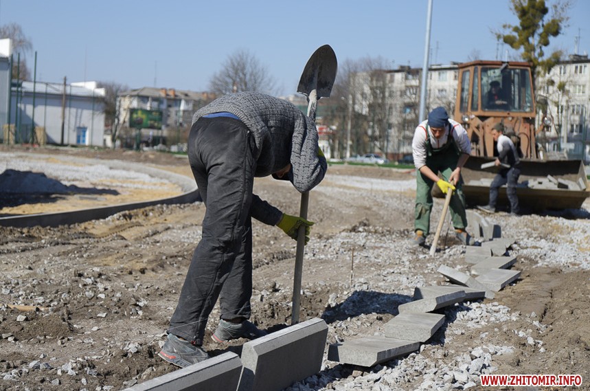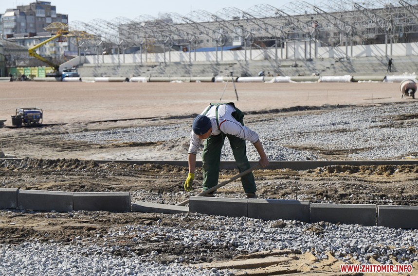 4 квітня на об’єкті кипить робота: працівники облаштовують тротуар, ладнають конструкцію накриття над трибуною, задіяна «важка» техніка.