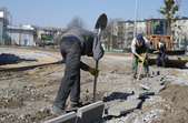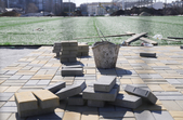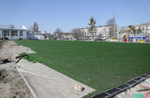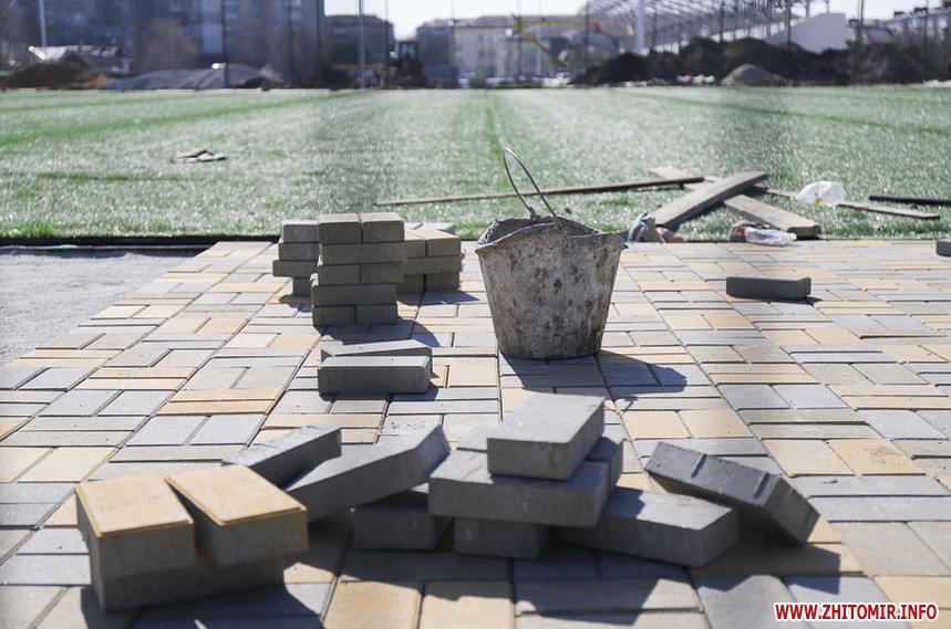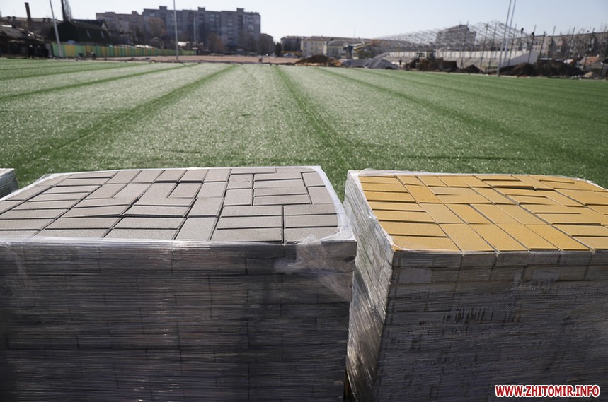 «Цеглинки» тротуарної плитки, відро з сумішшю цементу, рулони штучної трави та бетонні майбутні сидіння для глядачів – «картинки» з житомирського стадіону «Спартак», де досі триває комплексна реконструкція.