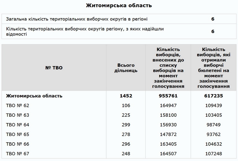 Станом на ранок 5 квітня на сайті ЦВК є оновлені результати голосування по округах Житомирської області та дані про явку виборців.