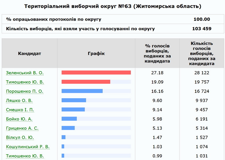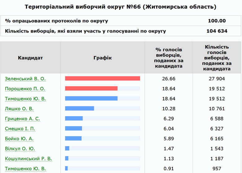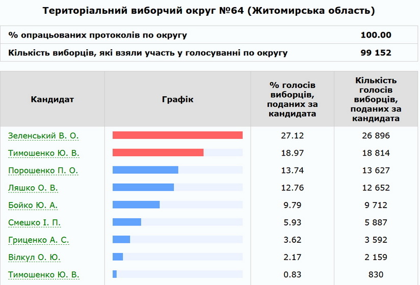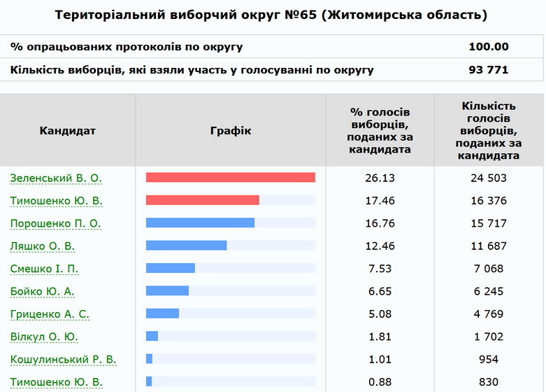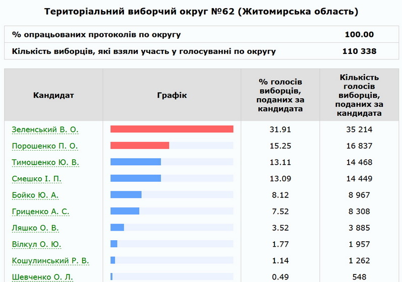 Як повідомляв Житомир.info, результати всіх протоколів ОВК Житомирської області Центральна виборча комісія отримала ввечері 2 квітня: в усіх округах переміг кандидат Володимир Зеленський, в п’яти на другому місці Юлія Тимошенко, в Житомирі (округ №62) – Петро Порошенко.
