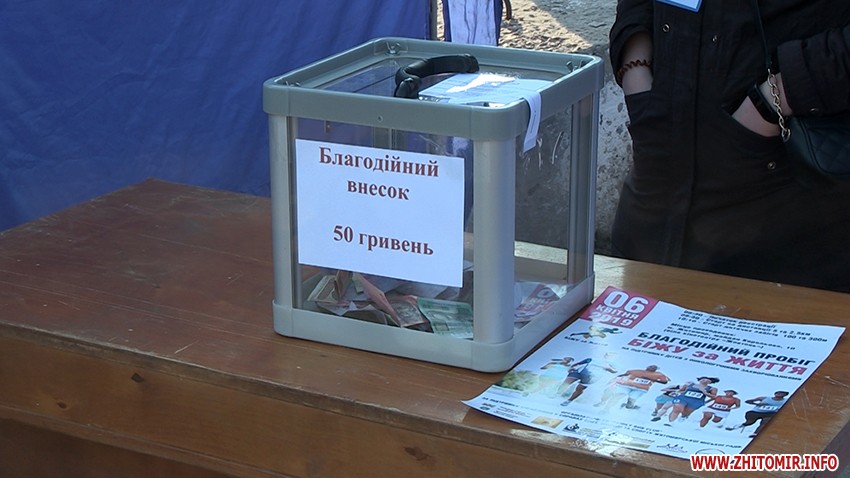 У Житомирі 6 квітня відбувся перший благодійний забіг на підтримку онкохворих «Біжу за життя». У ньому взяло участь близько 500 людей. Дорослі долали дистанції у 2,5 та 5 км, а діти бігли 100 та 300 метрів. Аби долучитись до забігу, кожен учасник мав зареєструватись та зробити благодійний внесок. Таким чином організатори планують зібрати 50 тисяч гривень, які потім передадуть онкогематологічному відділенню Житомирської обласної дитячої лікарні.