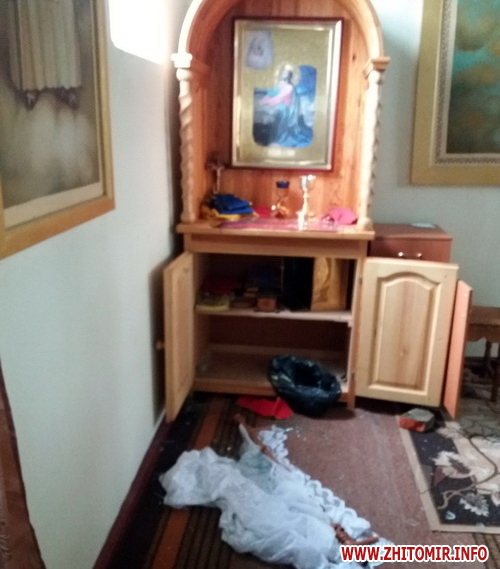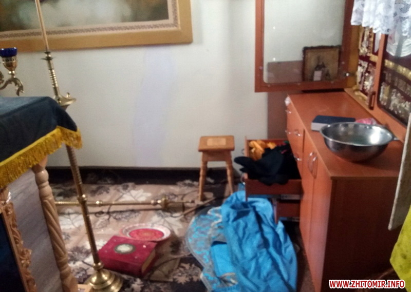 «Коли прибув я, то застав найбільший безлад у вівтарі — на підлозі скло від розбитого вікна, у яке залізли грабіжники, все поперевертали — на кліросі порозкидали книги, шухляди повідкривані — якісь гроші таки знайшли та забрали. Вкрали вино для Євхаристії, два коп’я, апостол», — розповів клірик Овруцької єпархії.