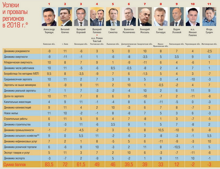 «После президентских выборов, каким бы ни был их исход, может обновиться руководство многих областных госадминистраций. Понятно, что главными мотивами будут политические, включая и подготовку к выборам в парламент. Но социально-экономические показатели областей тоже могут сыграть свою роль. Сейчас мы подводим итоги за 2018 г. Сравниваются показатели 23 мирных регионов (без оккупированных АРК и Севастополя и наполовину оккупированных Донетчины и Луганщины) по 20 общественно значимым критериям. Все цифры берутся из сводок Госстата и его территориальных органов», - сообщает издание.