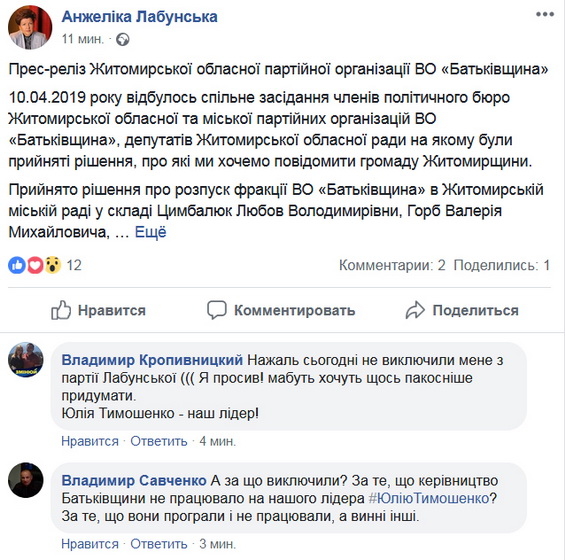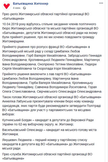 «Прийнято рішення про розпуск фракції ВО «Батьківщина» в Житомирській міській раді у складі Цимбалюк Любов Володимирівни, Горб Валерія Михайловича, Забродського Геннадія Олександровича, Кропивницької Людмили Геннадіївни, Мартинчук Івана Володимировича, Онопрієнко Тетяни Миколаївни, Пидюри Сергія Михайловича та Скоропада Ігоря Михайловича. Прийнято рішення виключити з лав партії ВО «Батьківщина» Цимбалюк Любов Володимирівну, Мартинчука Івана Володимировича, Горба Валерія Михайловича, Кропивницьку Людмилу Геннадіївну, Савченка Володимира Йосиповича, Горая Олега Станіславовича, Свірчевського Олександра Олександровича», - йдеться у заяві.