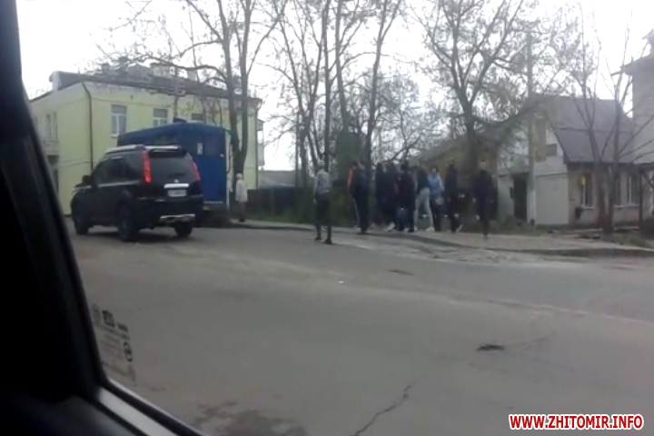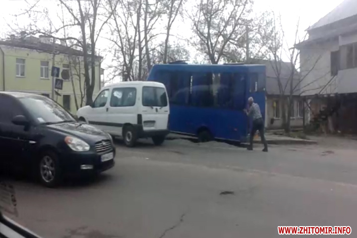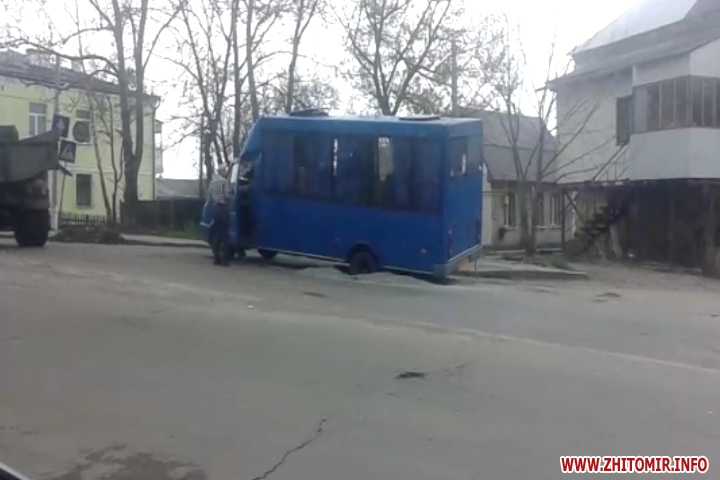 На вулиці Троянівській у Житомирі 11 квітня маршрутка №5 «Мальованка – Польова» застрягла в ямі на дорозі.