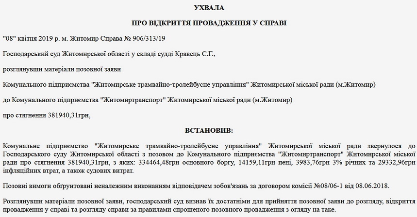 «Комунальне підприємство "Житомирське трамвайно-тролейбусне управління" Житомирської міської ради звернулося до Господарського суду Житомирської області з позовом до Комунального підприємства "Житомиртранспорт" Житомирської міської ради про стягнення 381940,31грн, з яких: 334464,48грн основного боргу, 14159,11 грн пені, 3983,76 грн 3% річних та 29332,96 грн інфляційних втрат, а також судових витрат. Позовні вимоги обґрунтовані неналежним виконанням відповідачем зобов'язань за договором комісії №08/06-1 від 08.06.2018», - йдеться в ухвалі суду, яка оприлюднена 10 квітня.