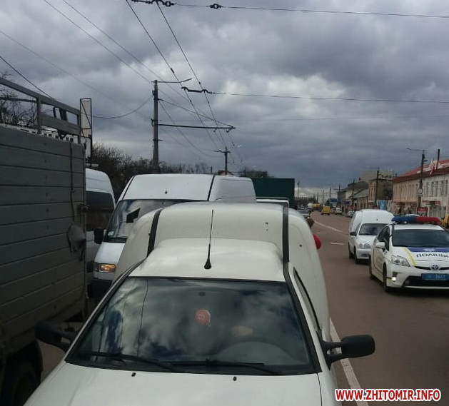 «Стосовно події, яка мала місце 11.03.2019, можемо повідомити наступне. На службовий планшет екіпажу патрульної поліції надійшло повідомлення зі служби «102» про те, що 11.03.2019 о 12:35 за адресою: м. Житомир, Богунський район, просп. Незалежності, буд. 20-22, заявник повідомив, що з боку Богунії, перед світлофором дорожній знак «Рух прямо» може зірватися та впасти. Вільний патруль отримав цей виклик о 14:26, опрацьований результат зазначено в електронному рапорті, зміст: «Прибувши на місце виклику було виявлено, що внаслідок сильного вітру на перехресті Покровська-просп. Незалежності, було зірвано дорожній знак «Напрямок руху по смузі», котрий впав на автомобіль Volkswagen Caddy під керуванням водія Р., що зупинився на червоний сигнал світлофора. Внаслідок падіння дорожнього знаку на т/з було розбито заднє скло дверцят багажника. У водія відібрано пояснення та заяву», - йдеться у відповіді на запит від 4 квітня 2019 року.
